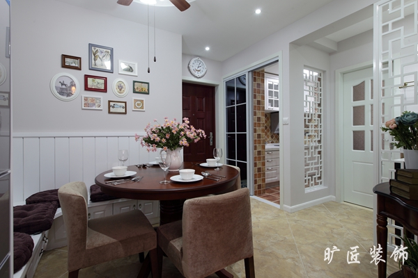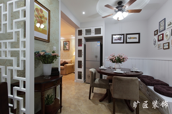 這是一個充滿濃濃北美風情的浪漫小屋,我們可以感受到在這個不大的空間里從各個角落散發出來的浪漫的氣息,業主一定是一對有情懷講求生活品質的小年輕吧~~餐廳的處理非常巧妙,充分利用了墻角的空間,設計出L形的座椅結構。天花板上復古的燈飾給整個餐廳平添了一份藝術格調。淺棕色的沙發,和咖啡色的茶幾、電視柜的顏色搭配顯得剛剛好,壁紙和墻面的掛圖打破了沉悶,讓整個空間頓時有了生氣。廚房和餐廳的接洽處理得游刃有余,動線合理,為浪漫生活增添了一些實在的煙火氣,沒錯,這就是煙火里的人生!