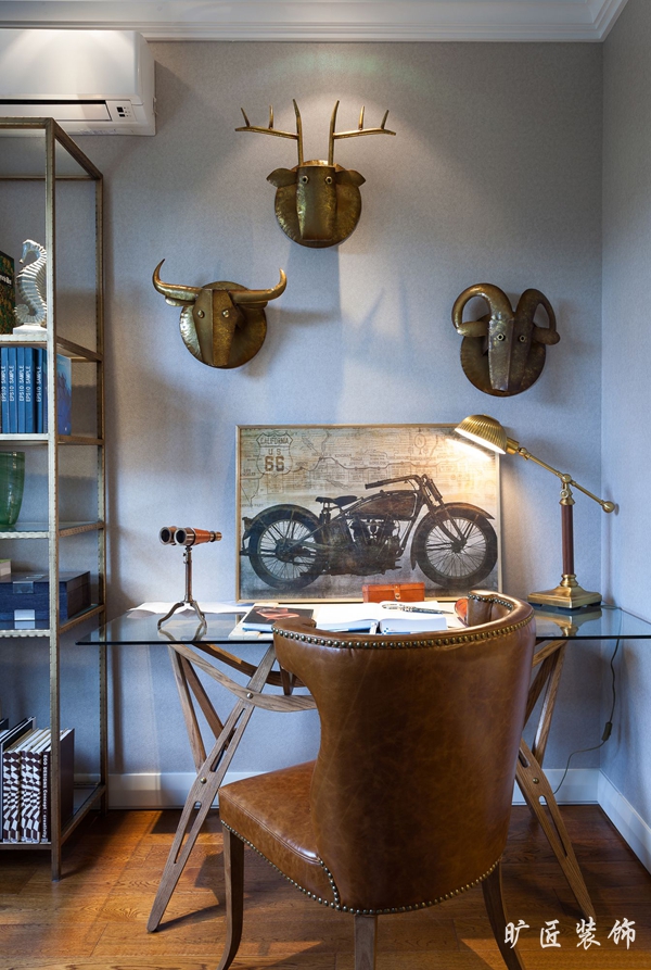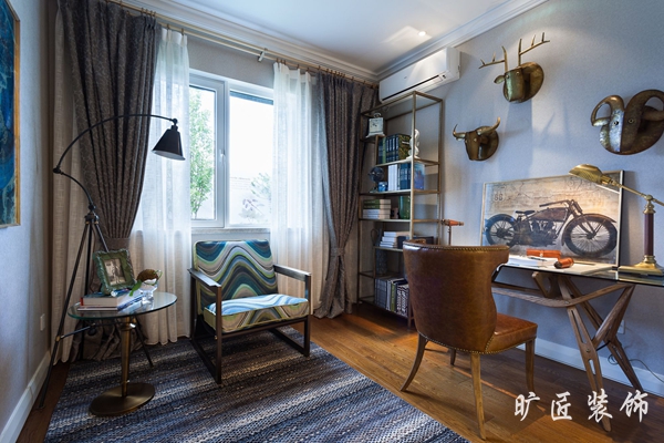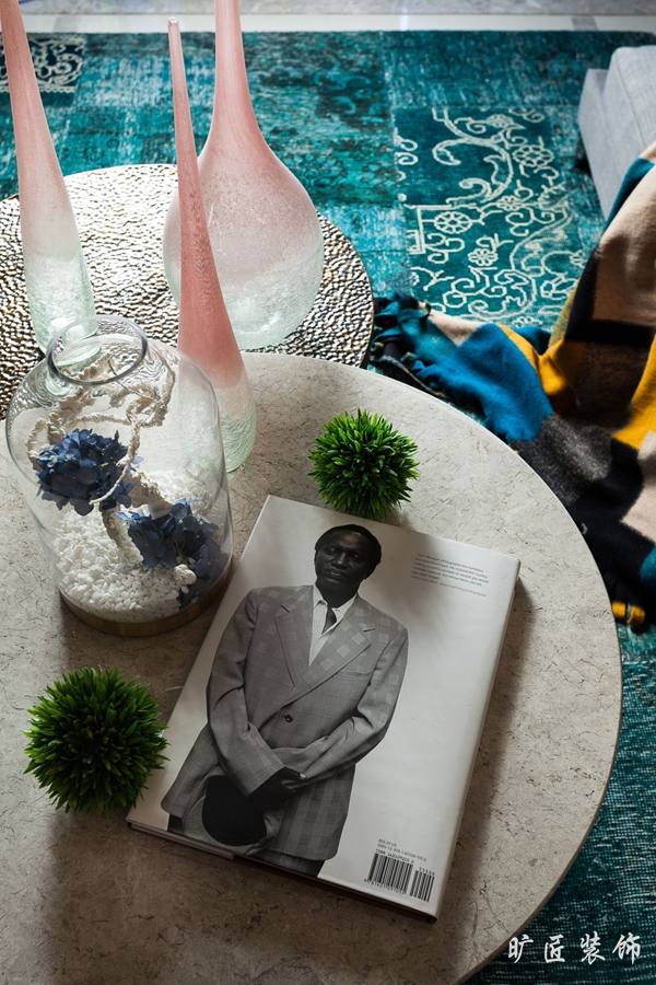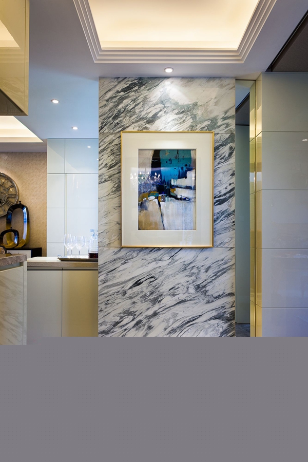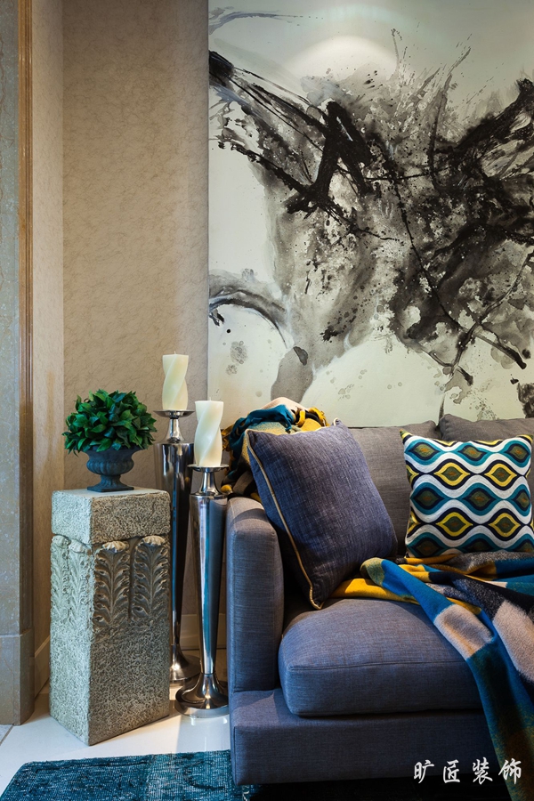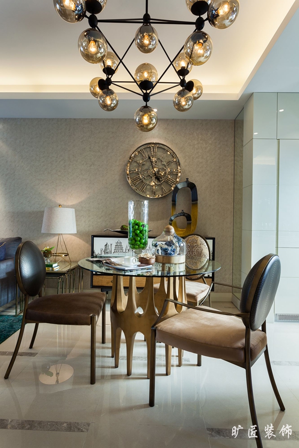 鮮明的色彩對比,大膽夸張的修飾,將現(xiàn)代時尚風(fēng)格演繹得如此不拘一格!亮黃色的電視背景從整個居室環(huán)境中跳脫出來,第一時間吸引了人們的眼球。紫檀色的沙發(fā),配上墻上的那幅抽象的水墨畫,頗有現(xiàn)代味道。客廳延伸出去隨即是餐廳,整個銜接和過度又是那么自然、和諧,金色的掛鐘和燈具,和餐桌餐椅的顏色相映襯,書房內(nèi)的一些金屬掛飾和擺件讓這個居室充滿質(zhì)感和時尚的味道,才華和愛好仿佛在生活中流淌。