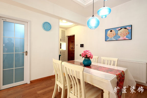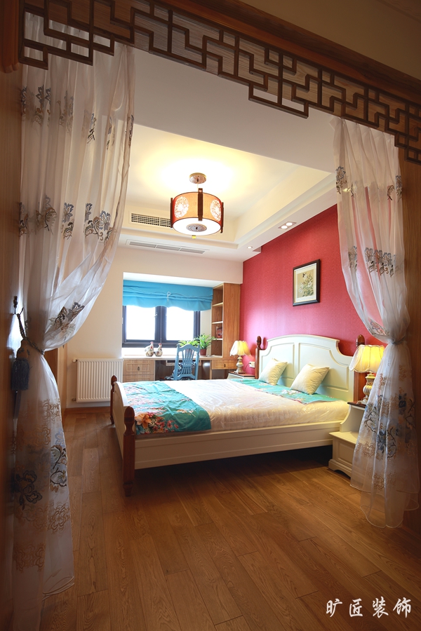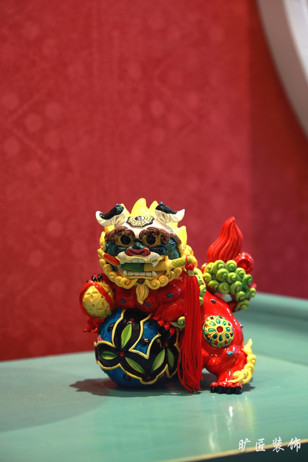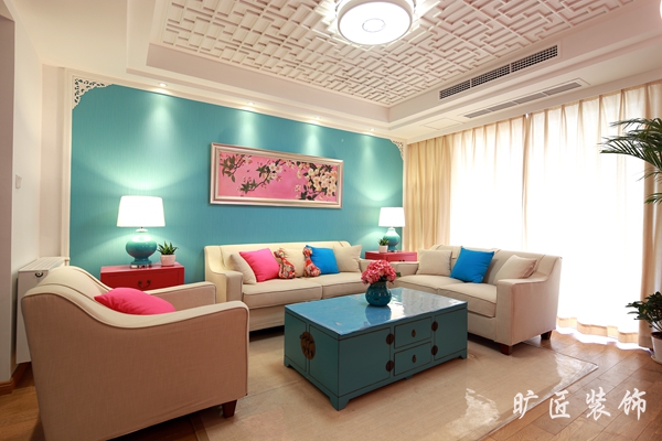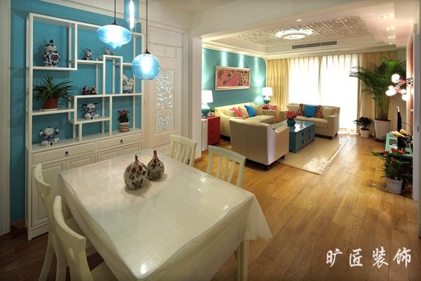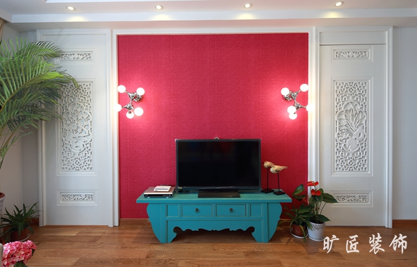 用色大膽,敢于嘗試一些小眾的顏色,玄關、電視背景墻以及一些掛畫或是小擺件等,無不彰顯著主人特立獨行的性格特點。居室主人甚至將中國傳統的元素非常靈活巧妙地用到了各個細節處,比如:電視柜的造型雕刻、電視背景的一些碉樓、臥室的類似窗欞雕花的隔斷、客廳上方富有設計感的吊頂以及隨處可見的一些帶有濃厚中國風的小物件,餐廳的那一男一女的中國娃娃掛畫特別有味道,還有玄關處柜子上的獅子繡球,桌上的陶瓷瓶,臥室的燈具,到處都可感受到一股濃濃的中國風撲面而來,卻又帶著一絲俏皮,緩緩而至。