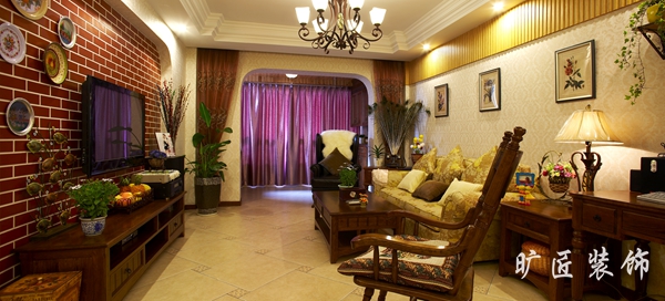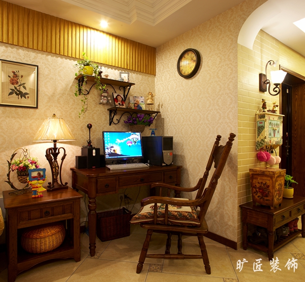 這是一個溫馨的三口之家。設計師為了令一所住宅增添家的情趣與感覺,處處用細節去點綴,令空間靈動、溫暖,充滿了樂趣。仿古磚、復合地板、墻紙、歐美燈飾的使用,又增添了一些玄關處木工做的酒柜兼具了實用性和裝飾性,每一處的裝飾都非刻意打造但卻處處融洽、自然。