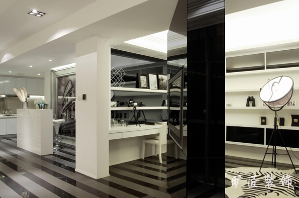 伴隨著可推動(dòng)進(jìn)而旋轉(zhuǎn)的黑色電視墻,起居室與工作間在類似游戲的方式中進(jìn)行置換,當(dāng)然,即便是在進(jìn)餐和品酒時(shí)也少不了看看電視。