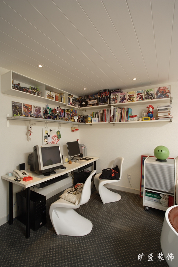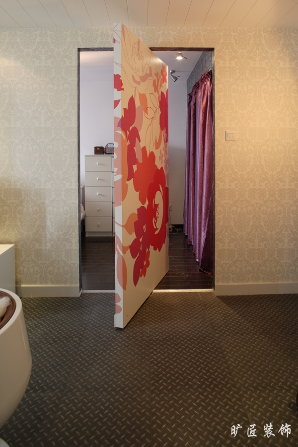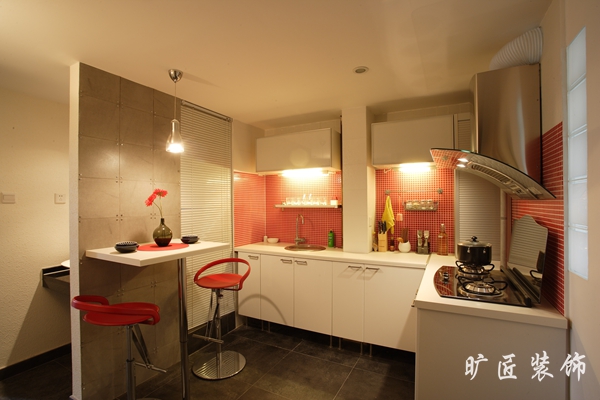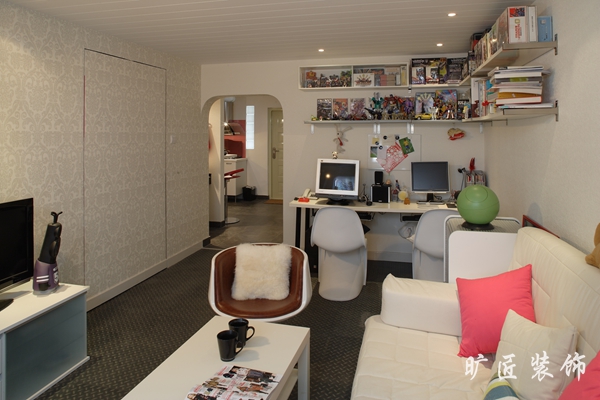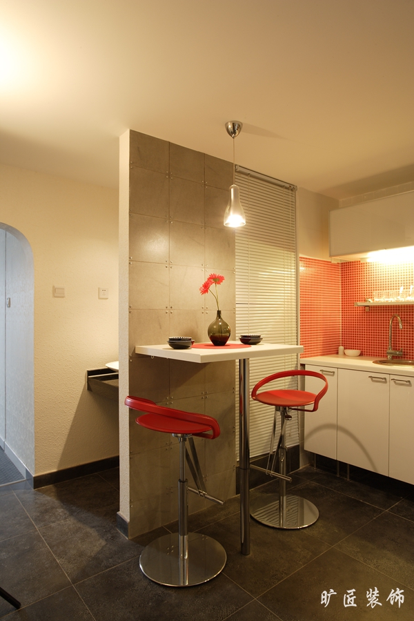 總想看到那樣一抹紅,它不似鮮花那樣嬌艷,也沒有晚霞那么絢麗,卻能打動人的心。在這間居室里,我們隨處可見這樣一道紅色,它仿佛是整個空間里的顏色精靈,在每個時空里自由穿梭。客廳、臥室、廚房都可以見到它,每天被這樣一個俏皮的東西環繞也是一件幸福的小事情。客廳小而精,設計師充分利用到墻面的小角落,在這里設置一個電腦桌,上方是書架兼具陳列的功能。客廳和臥室之間的旋轉門是一大創新之處,無疑增加了臥室的私密性,也讓整個動線充滿了趣味可言,原來在小空間里也可以玩轉趣味。廚房雖然沒有窗戶提供充足的光線,但櫥柜上方的兩盞燈剛好可以填補這一空缺。早餐臺的設計讓整個廚房更有情調,在形態組合上又顯得跟灶臺對稱相得益彰,空間上也增添了不少美感。
